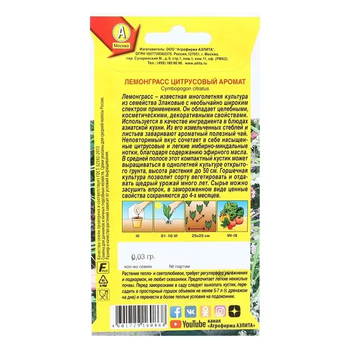 Лемонграсс – известная многолетняя культура из семейства Злаковые с необычайно широким спектром применения. Он обладает целебными, косметическими, декоративными свойствами. Используется в качестве ингредиента в блюдах азиатской кухни. Из его измельченных стеблей и листьев заваривают ароматный полезный чай. Неповторимый вкус сочетает в себе насыщенные цитрусовые и легкие имбирно-миндальные нотки, благодаря содержанию эфирного масла. В средней полосе этот компактный кустик может выращиваться в однолетней культуре открытого грунта, высота растения до 50 см. Горшечная культура позволит сорту вегетировать и отдавать щедрый урожай много лет. Сырье можно засушить впрок, в замороженном виде ценные свойства сохраняются до 4-х месяцев.