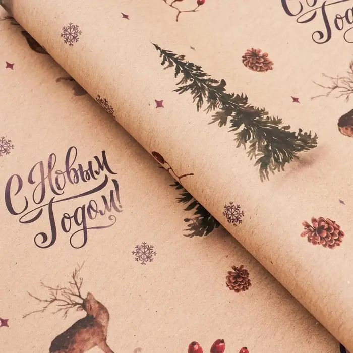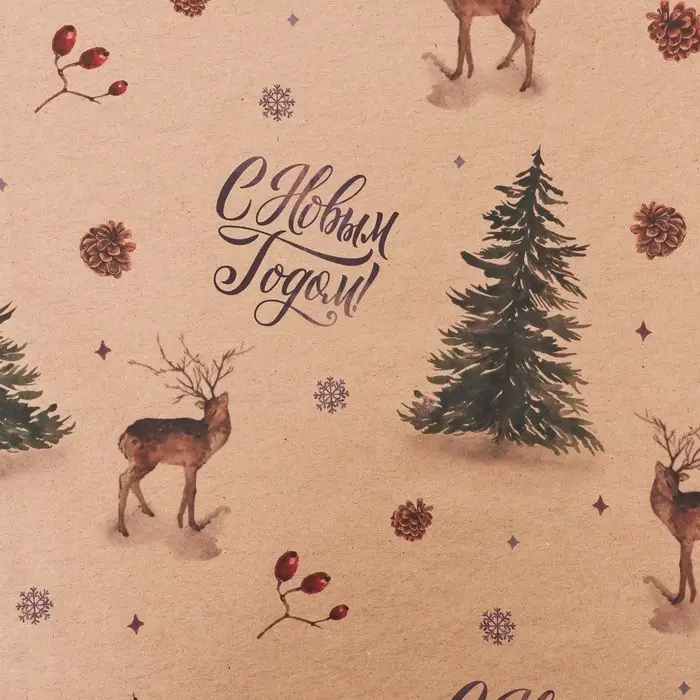 Бумага упаковочная новогодняя крафт бурый «Олени в лесу», 50×70 см