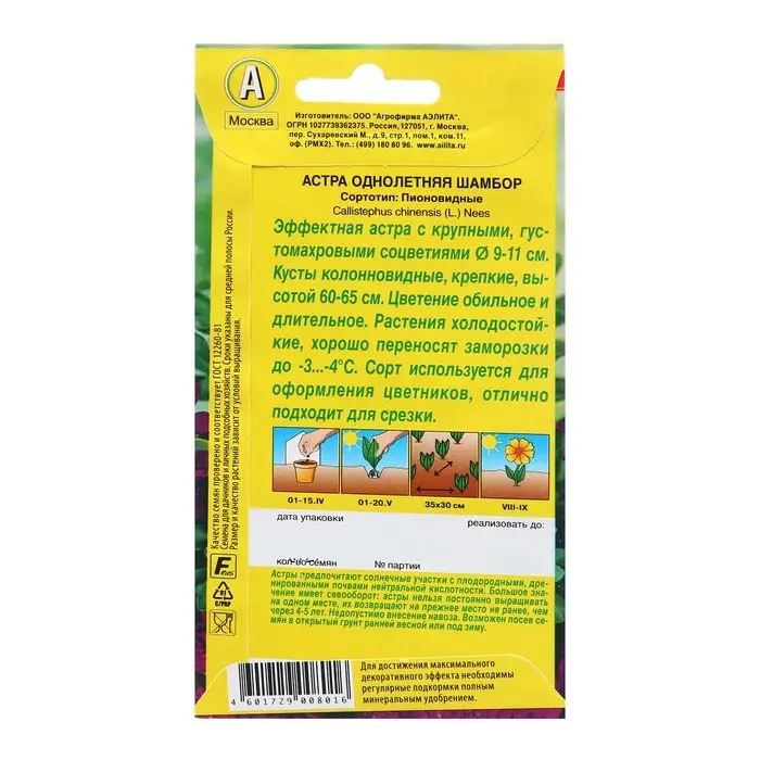 "Эффектная, долгоцветущая астра с крупными (9-11 см), густомахровыми соцветиями. Кусты колонновидные, крепкие, высотой 60-65 см, с многочисленными цветоносами. Цветение раннее и обильное. Растения холодостойкие, хорошо переносят воздействие дождя и ветра. Астра предпочитает солнечное местоположение, не выносит застоя воды в почве. Используется для выращивания на клумбах и рабатках. Отлично подходит для срезки, цветы долго стоят в воде.