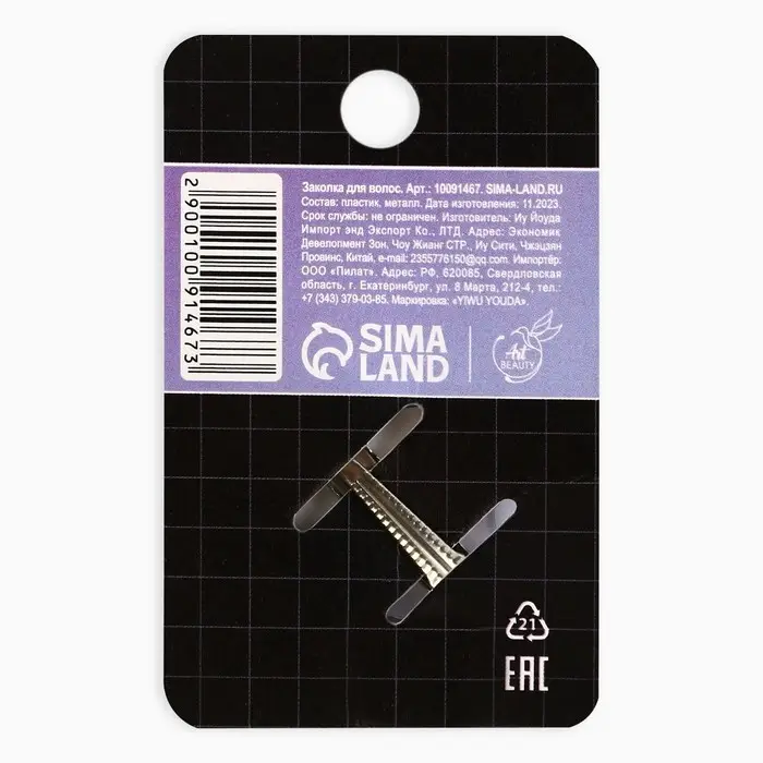 Краб для волос "Двойной зубец" классика, 8 см, микс