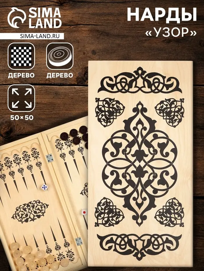 Нарды "Узор", деревянная доска 50х50 см. Нарды - настольная игра для двух игроков на специальной доске, разделённой на две половины. Цель игры - бросая кости и передвигая фишки в соответствии с выпавшими очками, пройти фишками полный круг по доске, зайти ими в свой дом и выбросить их за доску раньше, чем это сделает противник. Есть две основные разновидности - длинные и короткие нарды.
