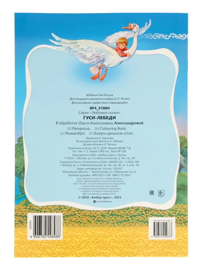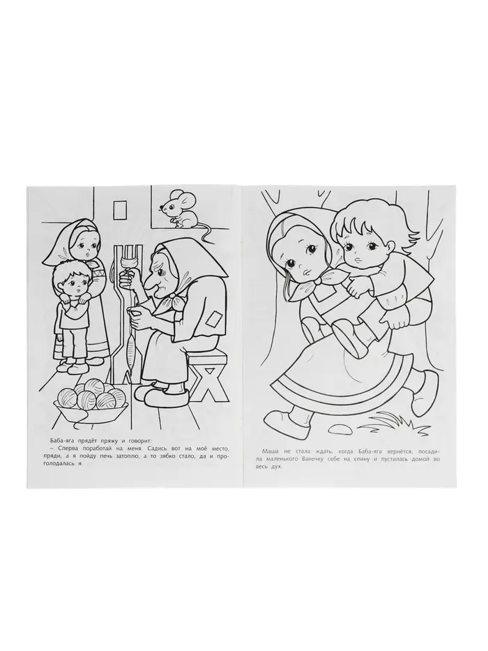 Раскраска «Гуси-лебеди» — это 8 страниц формата А4 с классическими изображениями, вдохновлёнными русской народной сказкой. Простой и удобный формат делает её идеальной для детей от 7 лет.