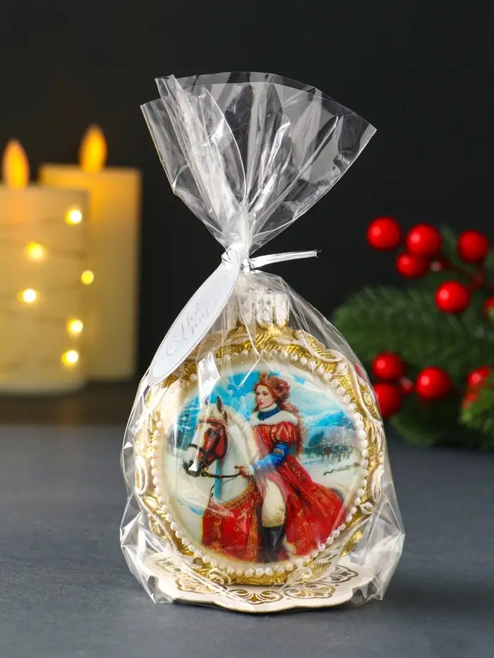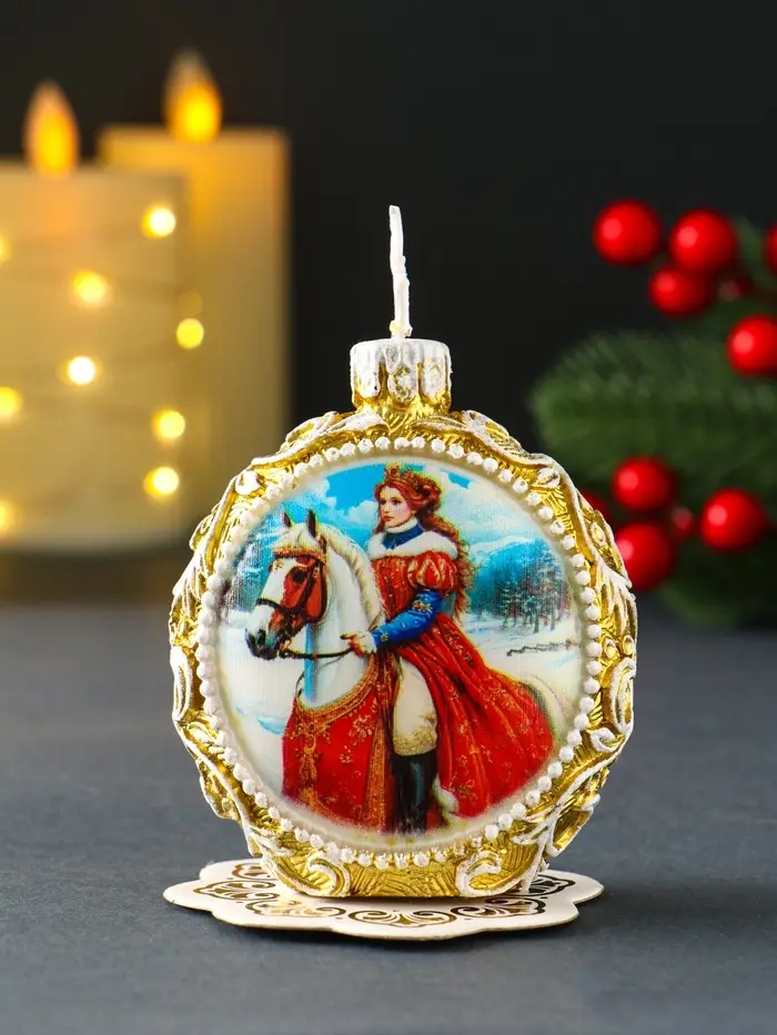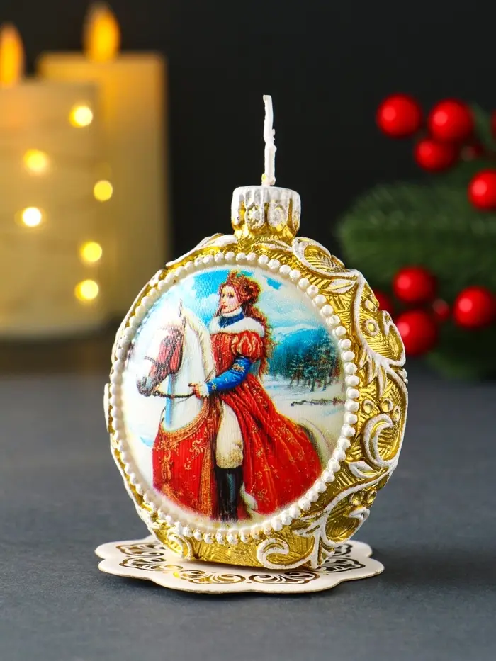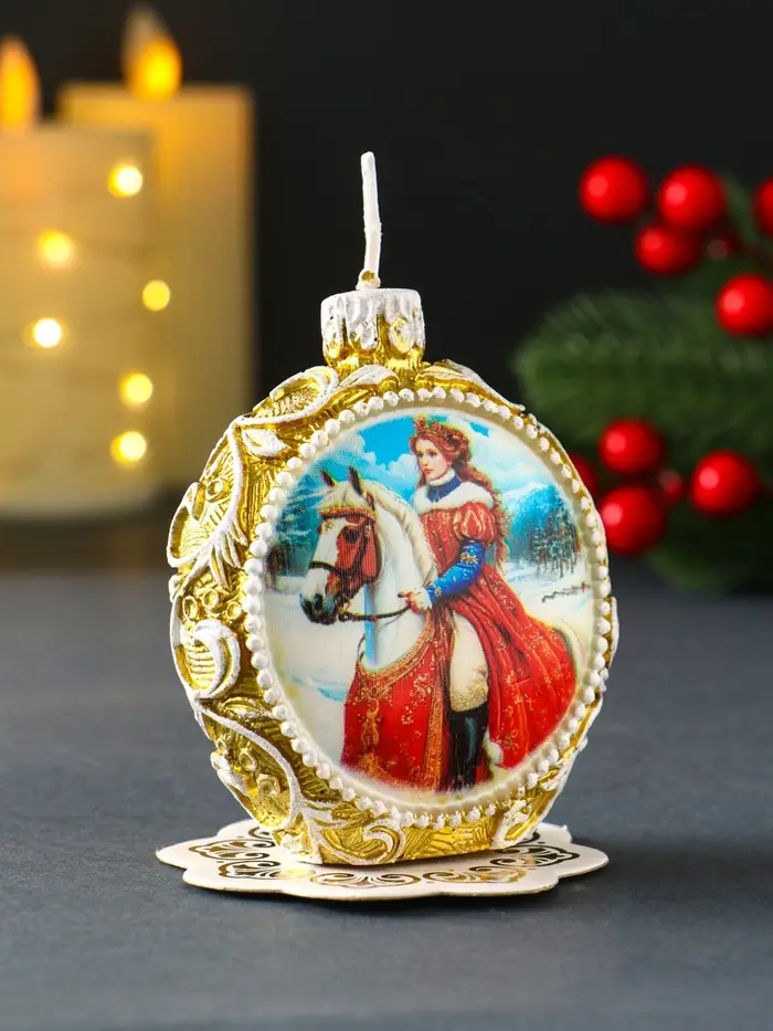 Свеча новогодняя "Шар узорный. Княгиня на коне" золотой 7,2х3,8х8,5 см