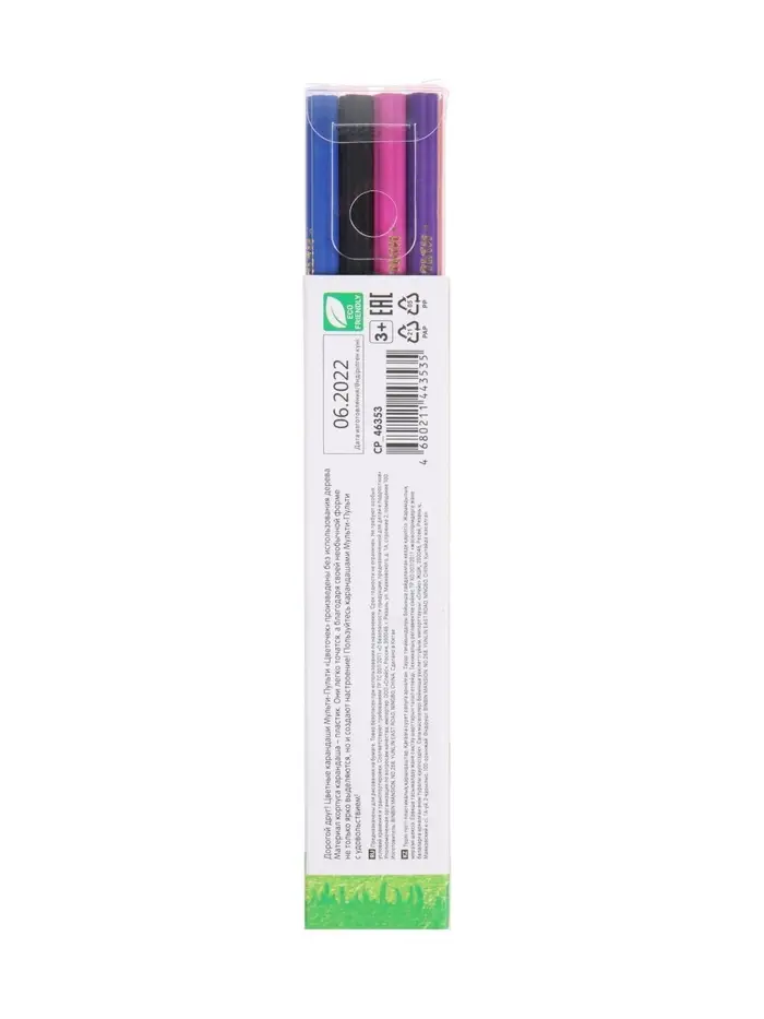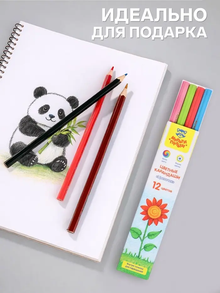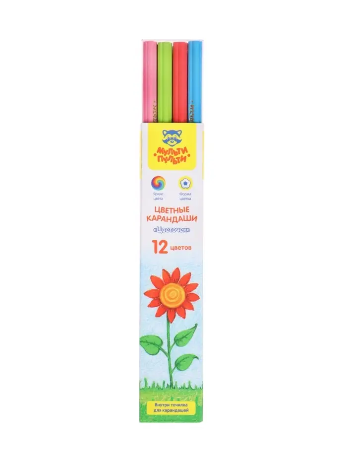 Карандаши цветные «Мульти-Пульти» серии «Цветочек» – продукт, который дарит эмоции и настроение. Радость от рисования обеспечивает мягкий грифель классического диаметра 3 мм, что также увеличивает срок службы карандаша. В наборе представлены 12 цветов карандашей и включена точилка. Пластиковый корпус полностью прокрашен в цвет грифеля, отлично затачивается и добавляет дополнительной привлекательности. Необычная форма в виде цветка восхитит как детей, так и взрослых. Карандаши упакованы в необычную коробку с прозрачным верхом и европодвесом и послужат отличным подарком ребенку! Товар предназначен для детей старше 3-х лет.