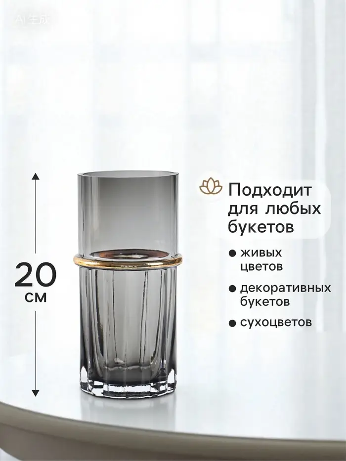 - Практичный размер: Высота 20 см и диаметр 8.5 см — оптимальные параметры для оформления компактных, но выразительных флористических композиций. Ваза не занимает много места, оставаясь заметным элементом декора.