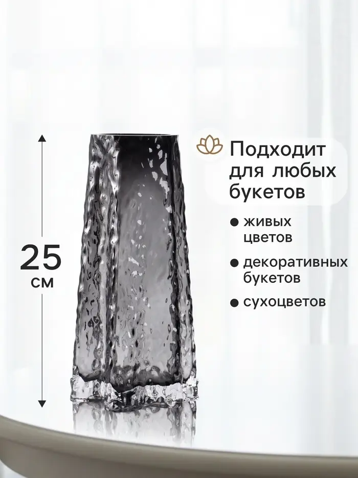- Универсальность в использовании: Форма и размер позволяют составлять как масштабные букеты, так и минималистичные аранжировки. Ваза органично впишется в современный интерьер, скандинавский стиль или лофт.