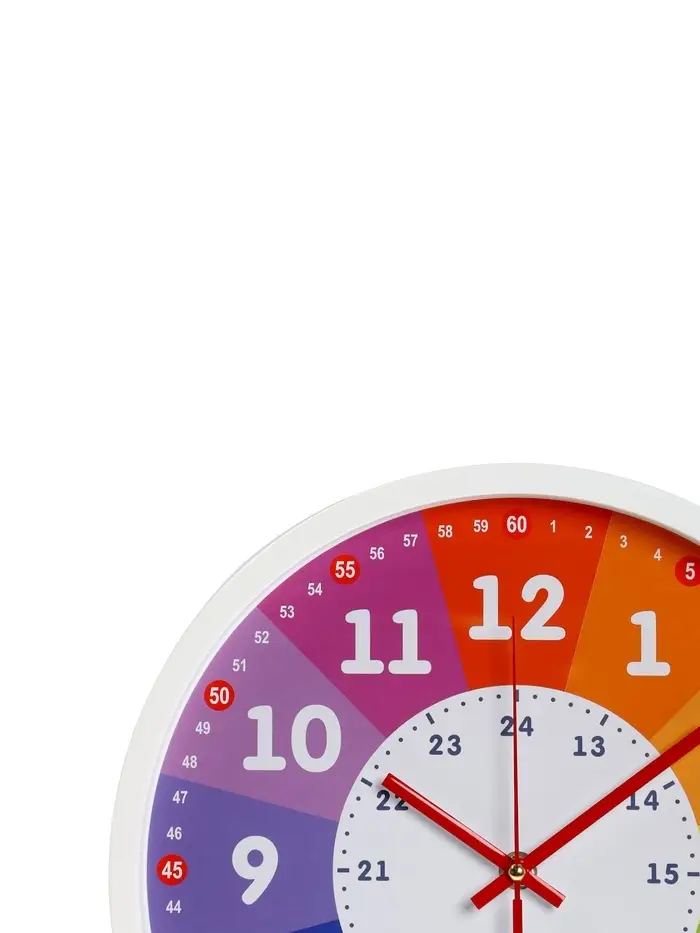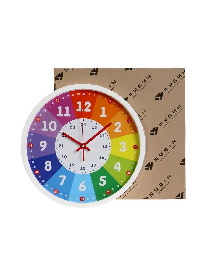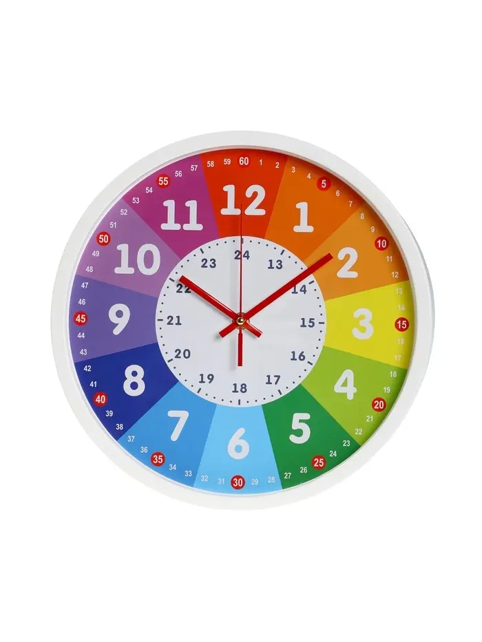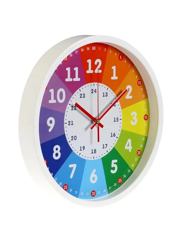 Белые настенные часы диаметром 30 см с круглой формой и кварцевым механизмом обеспечивают плавный ход стрелок и бесшумную работу, отлично подходя для детских пространств. Разноцветный циферблат с арабскими цифрами и тематикой игр привносит образовательный элемент, помогая ребёнку осваивать время через игровые мотивы.