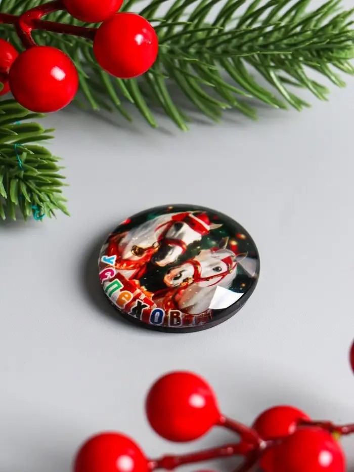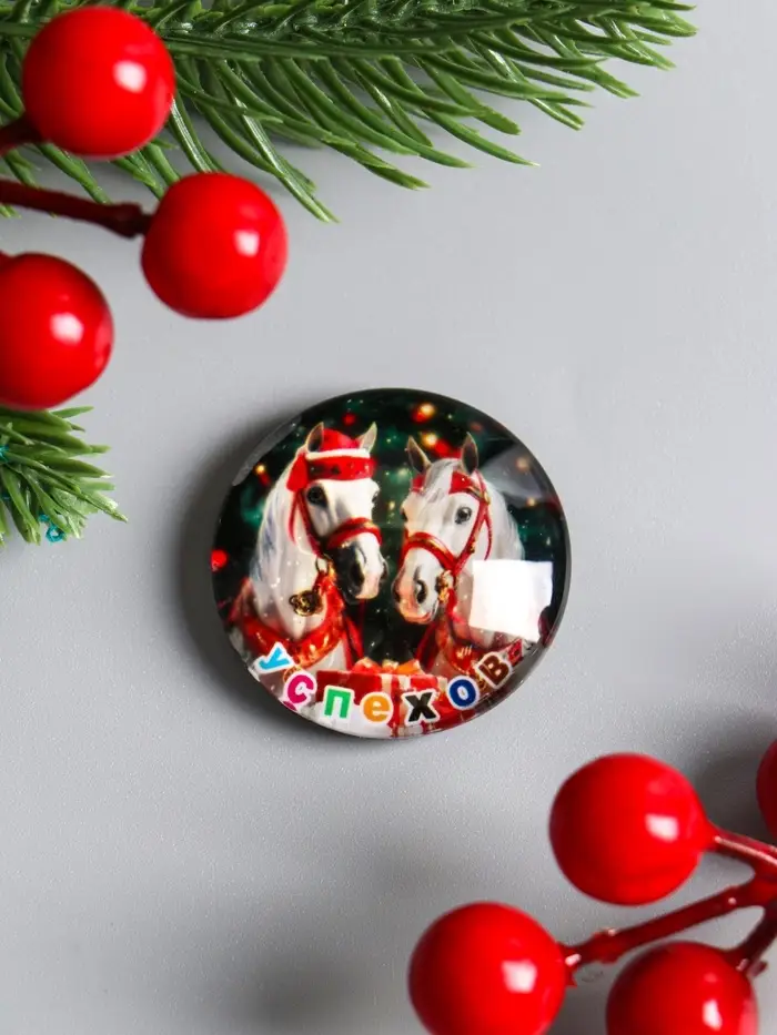 Магнит стекло "Двойка белоснежных коней - С Новым годом" d=3,3 см