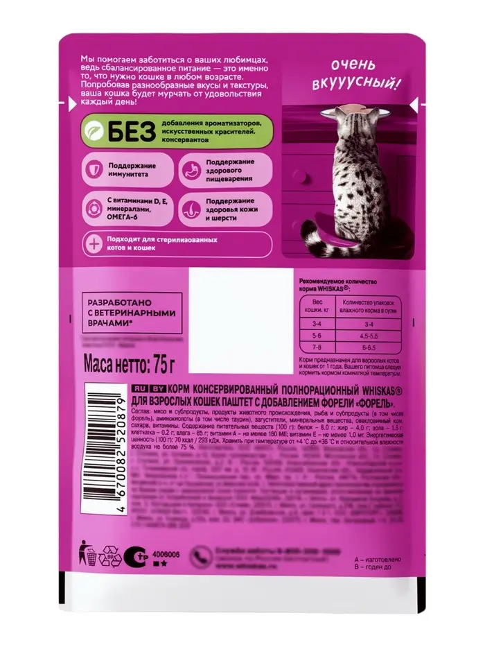 Рекомендации по хранению: Храните невскрытые упаковки при температуре от +1 °C до +30 °C. Откройте упаковку непосредственно перед кормлением, чтобы предложить кошке самое свежее угощение. Whiskas® «Мясной паштет с форелью» — это простой способ проявить заботу о вашем питомце каждый день.
