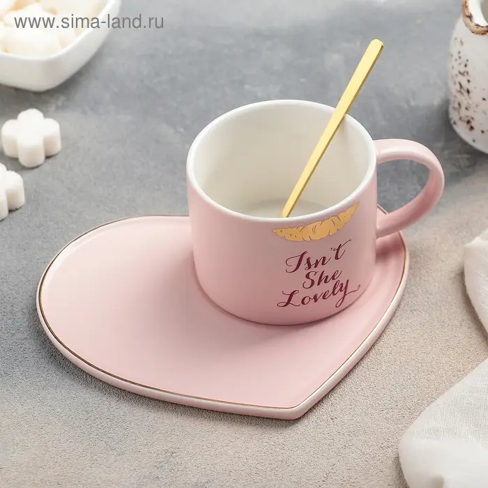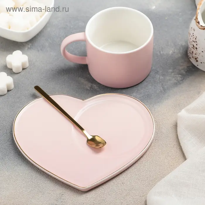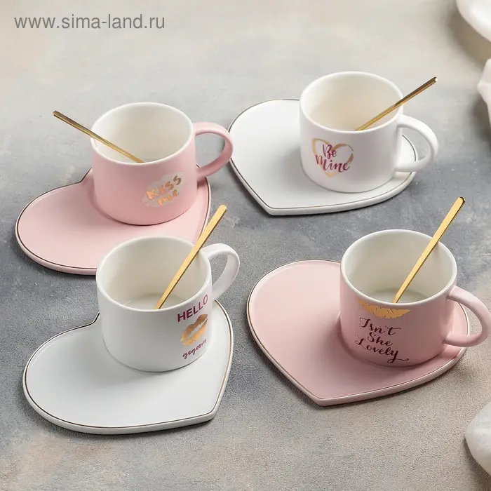 Чайная пара керамическая с ложкой «Поцелуй», 2 предмета: кружка 200 мл, тарелка 15,5×13,5 см, цвет МИКС