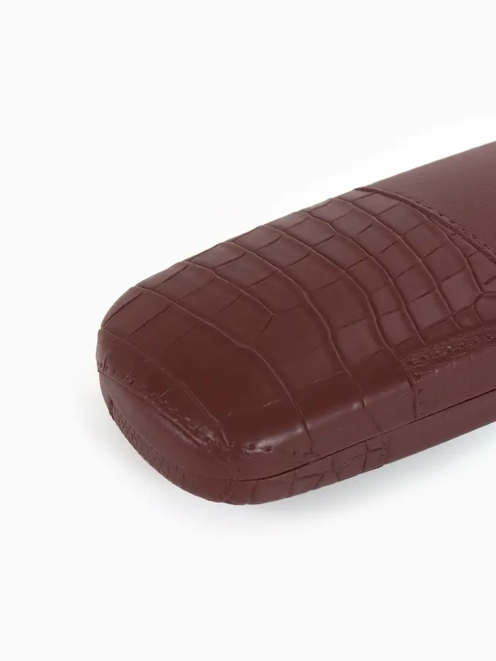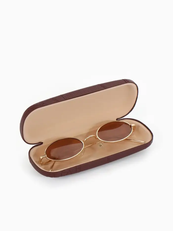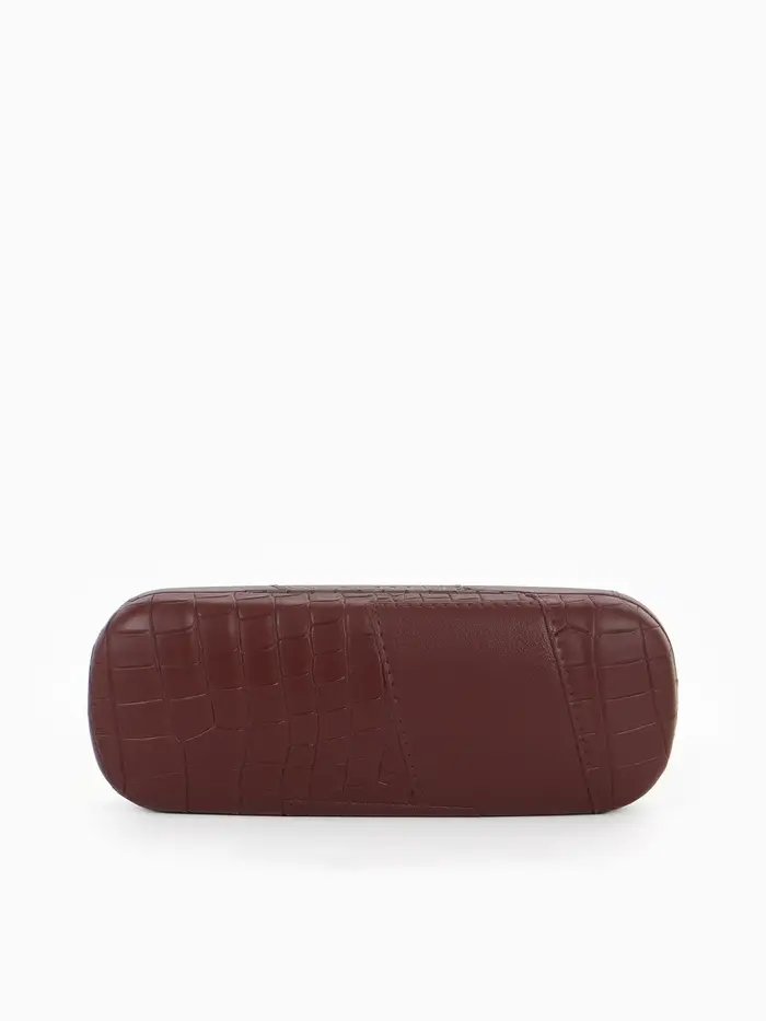 Этот коричневый футляр для очков с застёжкой-хлопушкой сочетает тёплый оттенок с компактной защитой. Узкий профиль удобен для переноски в кармане или небольшой сумке.