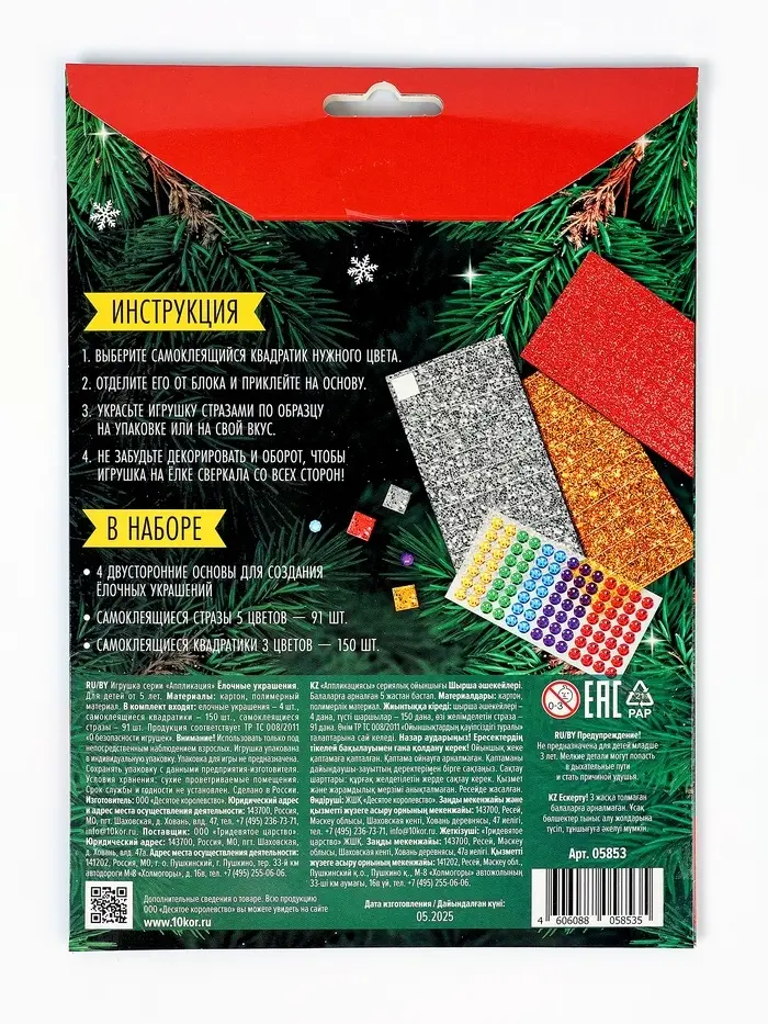 Набор для творчества. Аппликация "Ёлочные украшения" 4 шт (3 цв, 150 эл, стразы 91 шт) 1 конверт 109