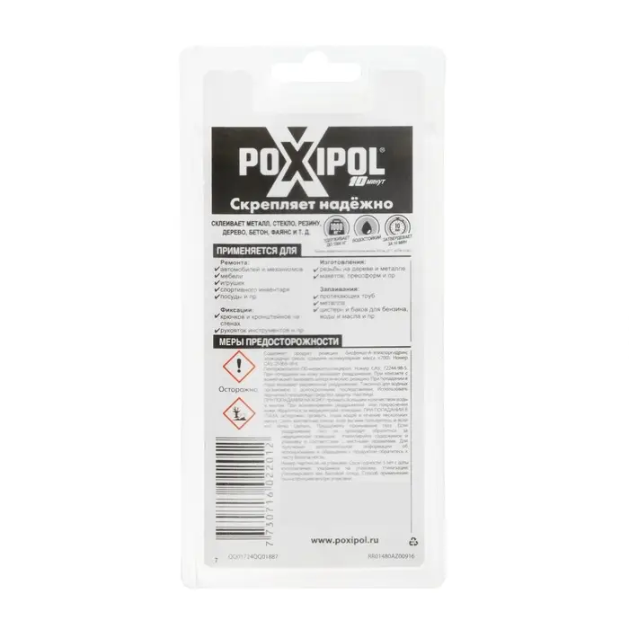 Двухкомпонентное клеящее вещество, легкое в применении и использовании. Склеивает самые разнообразные материалы: металл, бетон, фаянс, дерево, мрамор, пластмассу, стекло, железобетон, фиброцемент, керамику, гранит, фарфор. Благодаря своей прочности и долговечности, этот клей идеально подходит для использования в домашнем ремонте, в мастерской, автомобиле, на работе, для хобби и разнообразных поделок.