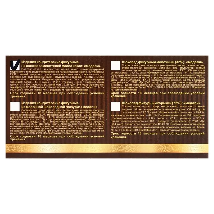 Состав: Сахар, заменитель масла какао нетемперируемый лауринового типа (растительное масло, эмульгаторы (сорбитан тристеарат, соевый лецитин), сыворотка молочная сухая, какао-порошок, ароматизаторы («Ванилин», «Шоколад», «Сливки»), эмульгаторы (соевый лецитин, Е476). Может содержать следы фундука.