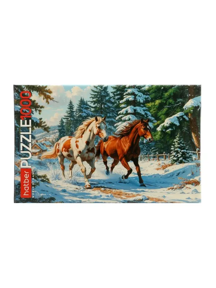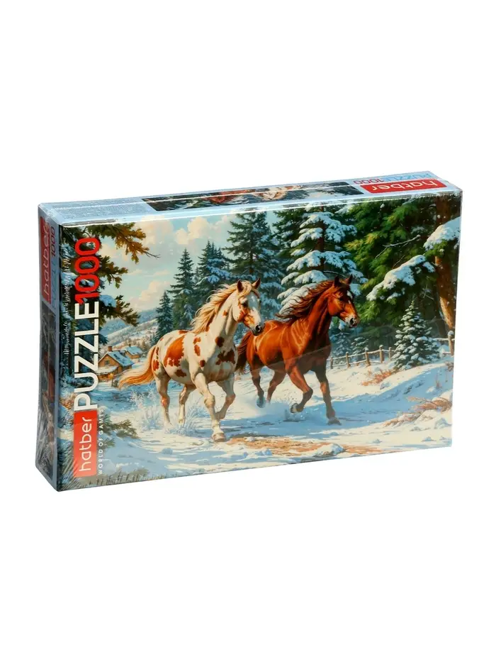 Пазл «Зимние грации» — это захватывающая головоломка из 1000 элементов, которая перенесёт вас в атмосферу зимней сказки. Собранная картинка с двумя грациозными конями, мчащимися по заснеженному лесу, станет источником вдохновения и уюта в вашем доме.