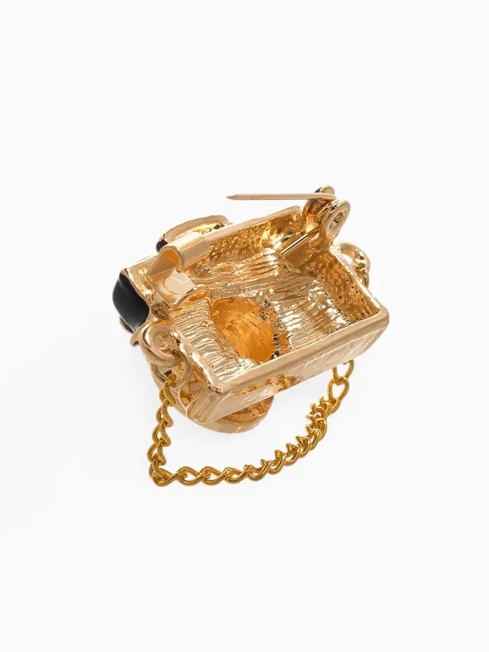 Брошь "Фотоаппарат" с жемчугом, чёрно-коричневая в золоте