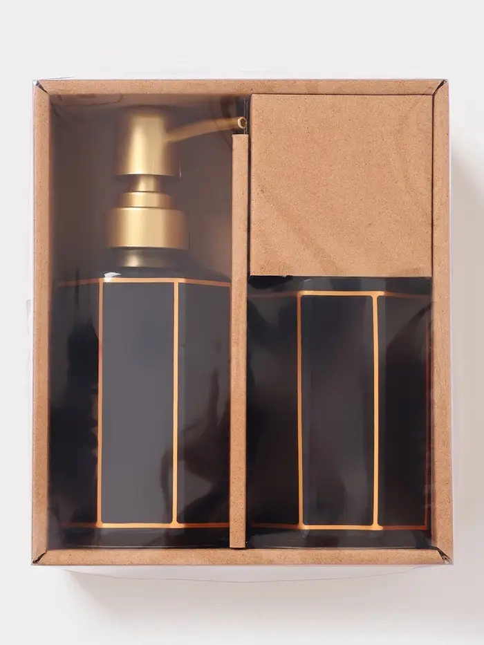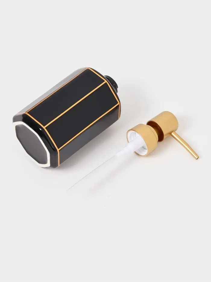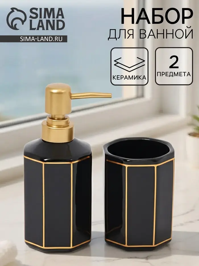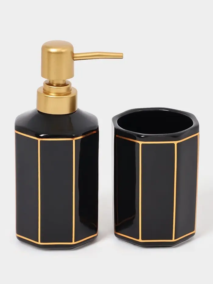 Керамический набор для ванной создает гармоничную композицию на любой поверхности. Дозатор для мыла и стакан в черном матовом исполнении сочетают минимализм с практичностью. Набор формирует организованное пространство для ежедневных ритуалов.