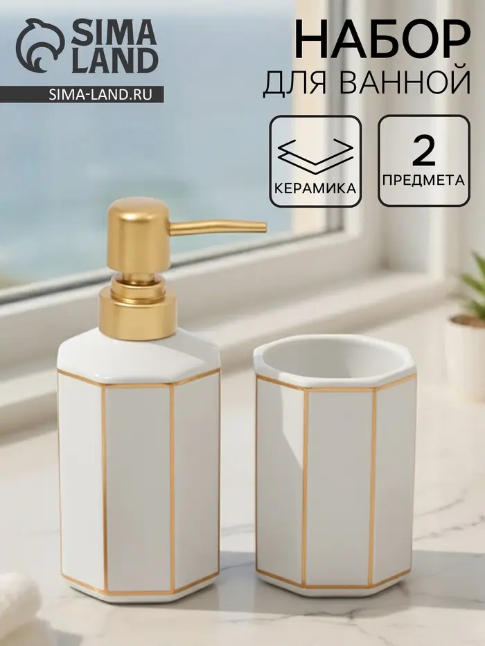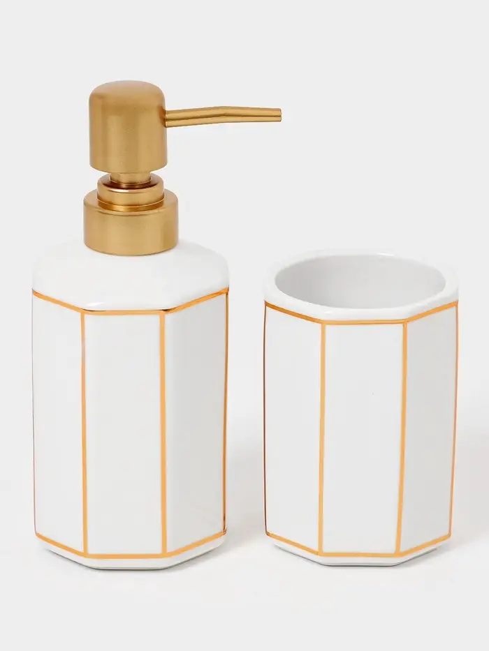 Керамический набор для ванной из двух предметов — практичное решение для поддержания порядка. Белый цвет и лаконичный дизайн легко вписываются в любой интерьер. Дозатор для мыла и стакан создают гармоничную композицию на раковине.