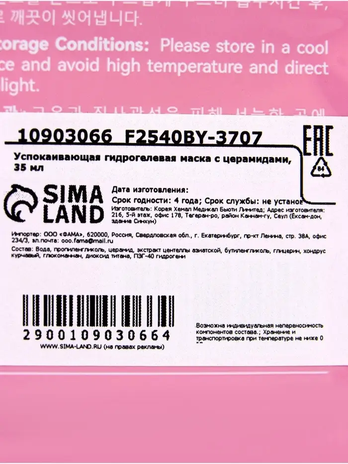 Успокаивающая гидрогелевая маска с церамидами, 35 мл