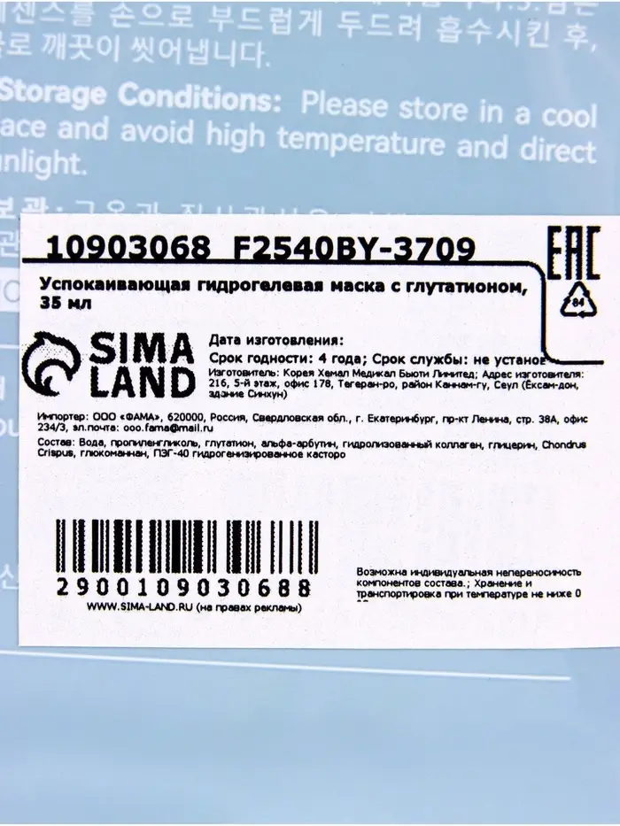 Гидрогелевая маска с глутатионом, успокаивающая, 35 мл
