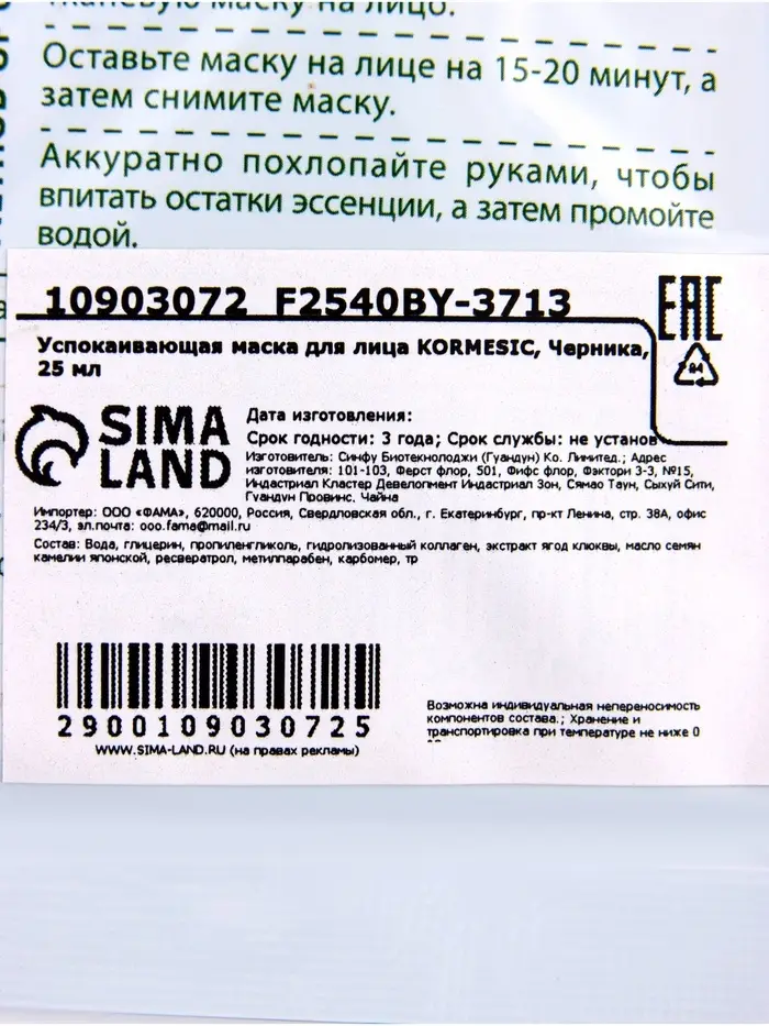 Успокаивающая маска для лица KORMESIC, Черника, 25 мл