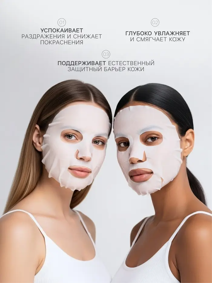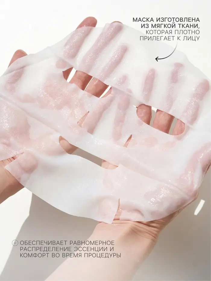 Мягкая тканевая основа плотно прилегает к лицу, равномерно распределяя эссенцию и создавая охлаждающий эффект. Уже после первого применения кожа выглядит более спокойной, увлажнённой и сияющей здоровьем.