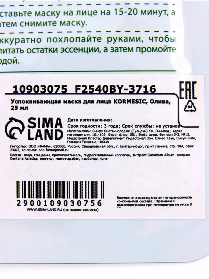 Успокаивающая маска для лица KORMESIC, Олива, 25 мл