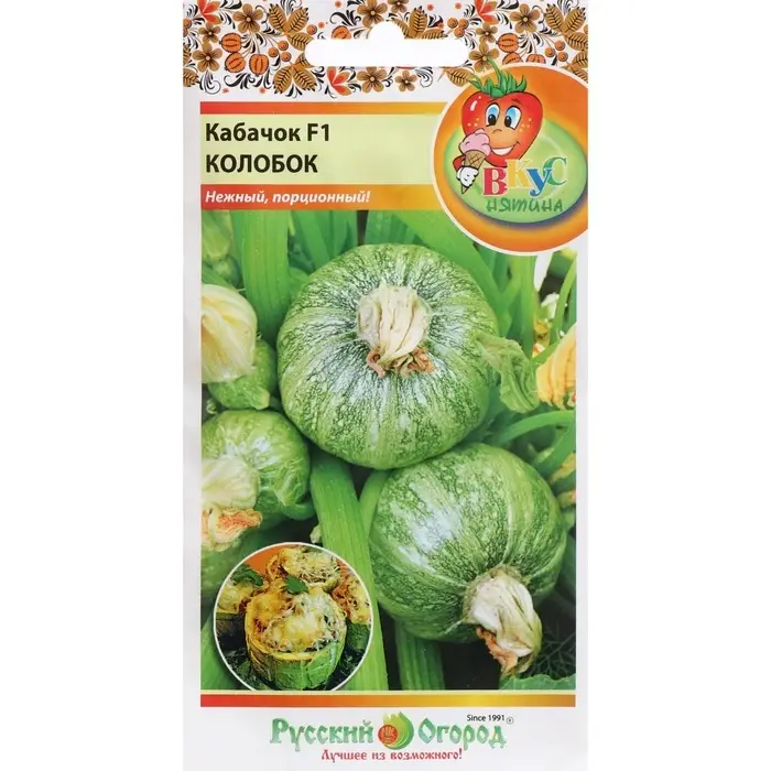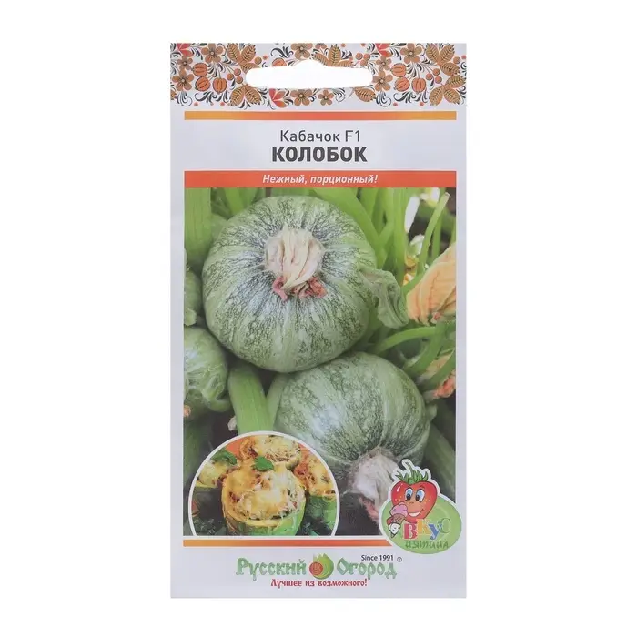 Скороспелый сорт, период вегетации 40 дней. Куст компактный, с многочисленными плодами. Плоды округлые, гладкие. Их лучше собирать ещё небольшими, диаметром 10-12 см. Кора тонкая, со светлым рисунком, долго не грубеет.