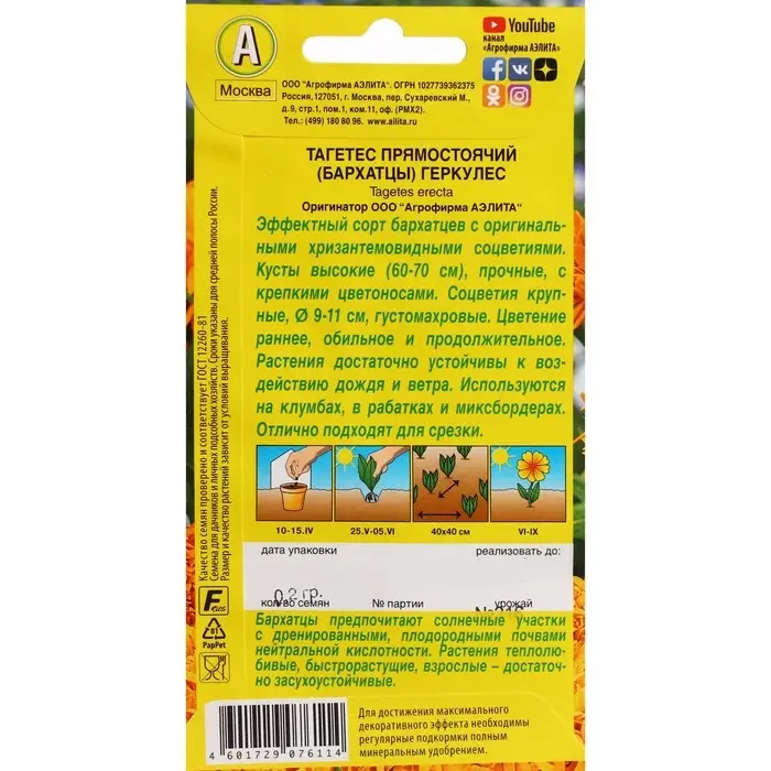 Семена Цветов Бархатцы "Геркулес", прямостоячие, ц/п, 0,2 г