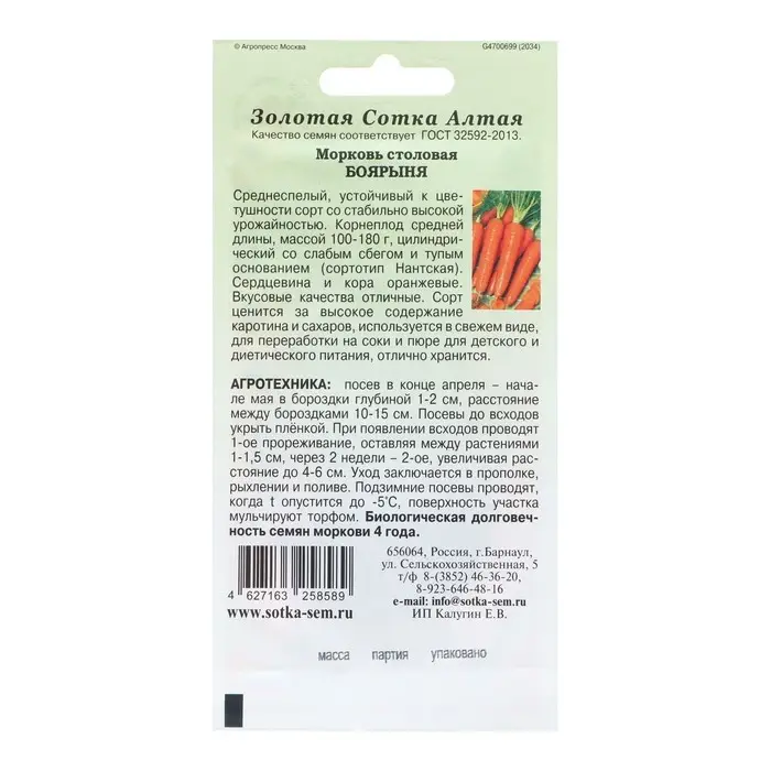 Семена Морковь "Боярыня", среднеспелая, 0,5 г
