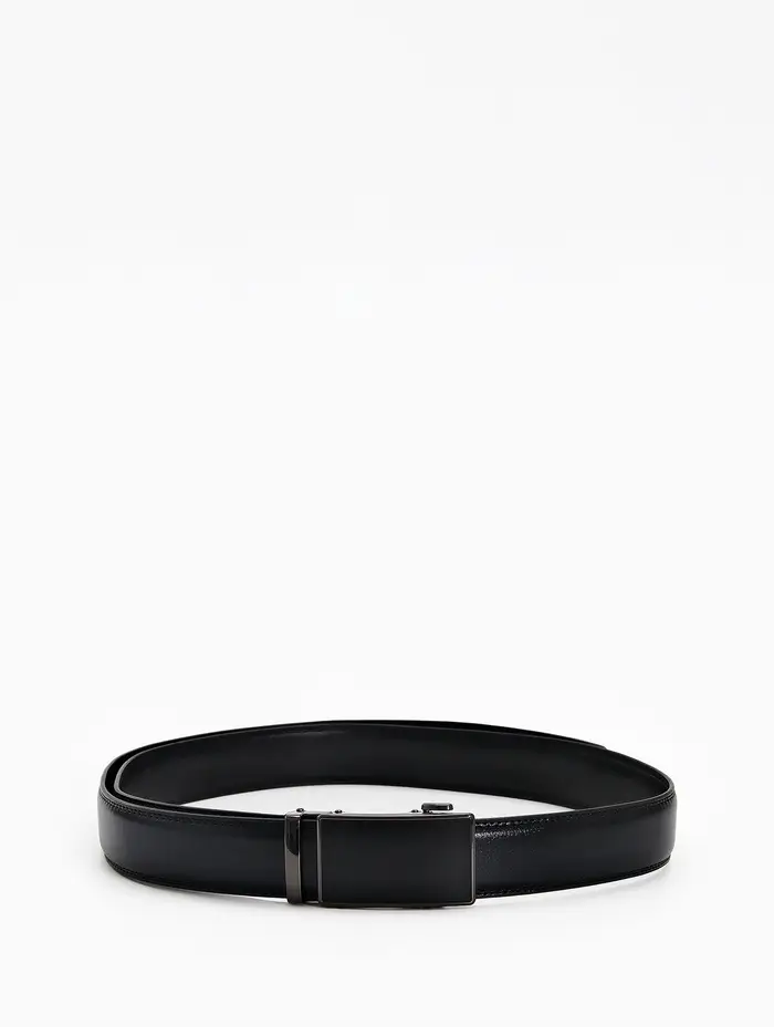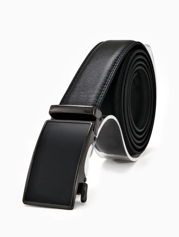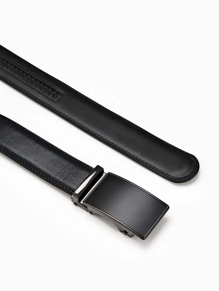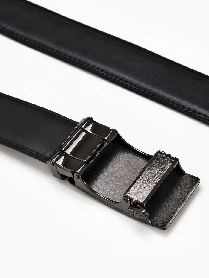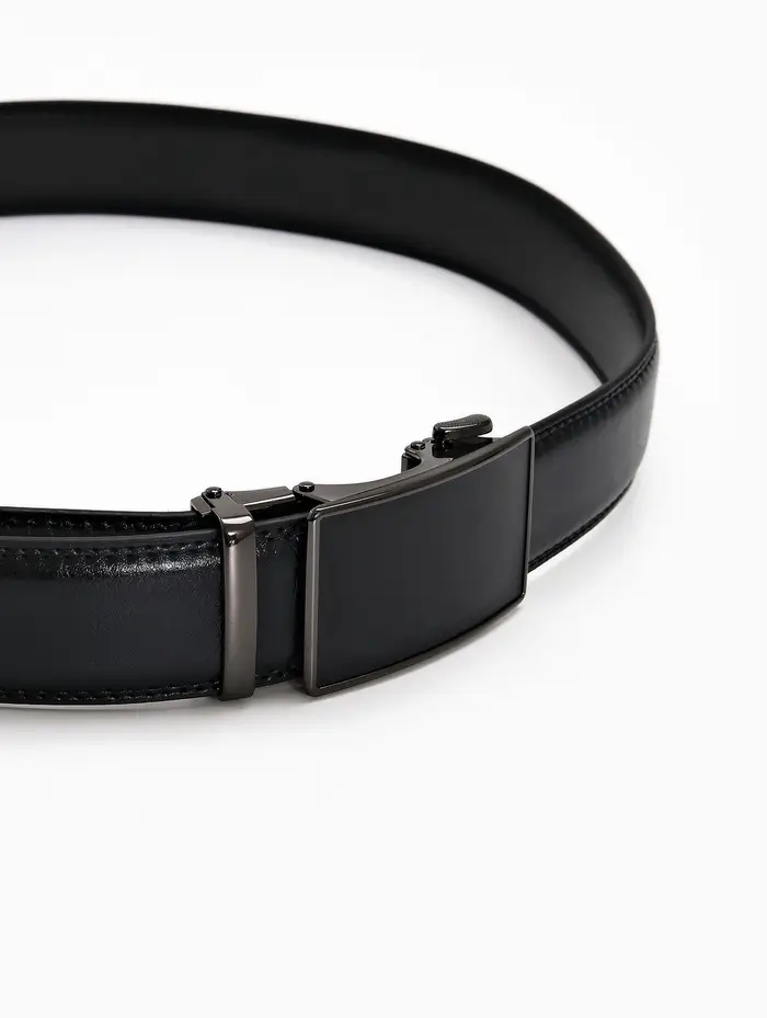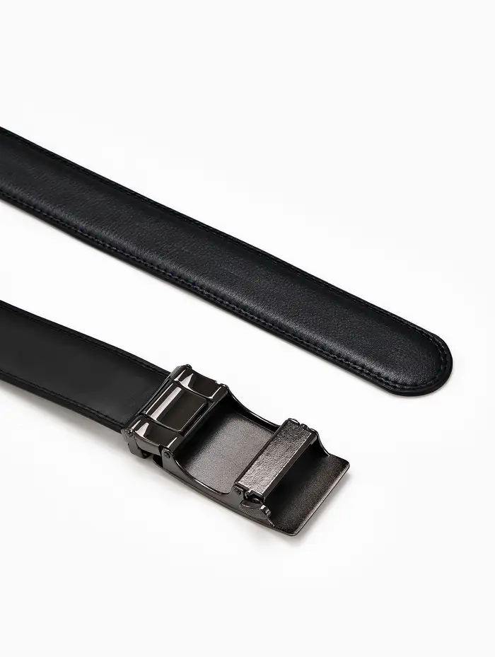Мужской кожаный ремень с автоматической пряжкой создает сдержанный акцент в деловом и повседневном гардеробе. Классическая ширина и удлиненная форма подходят для брюк и джинсов стандартного и большого размера.