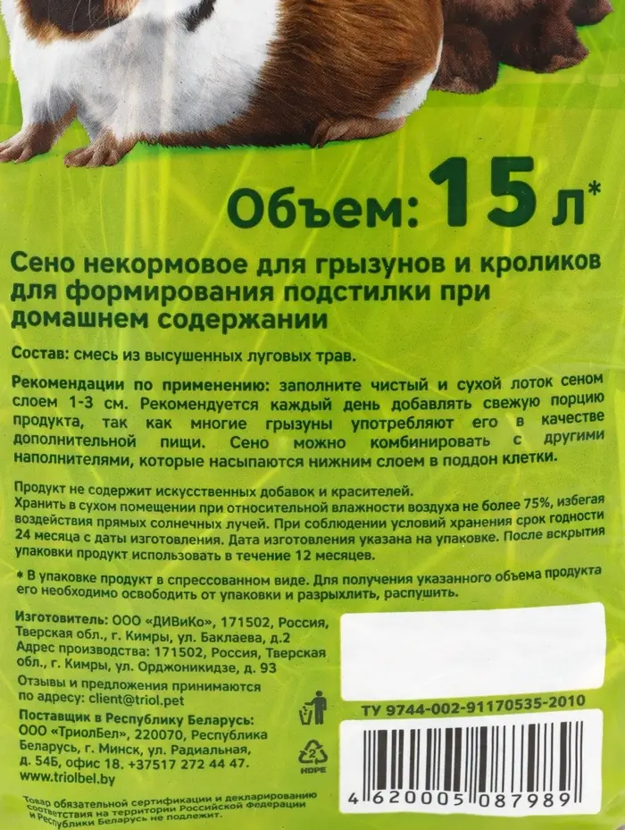 Сено луговое для грызунов и кроликов, 15л, серия LITTLE VILLAGE
