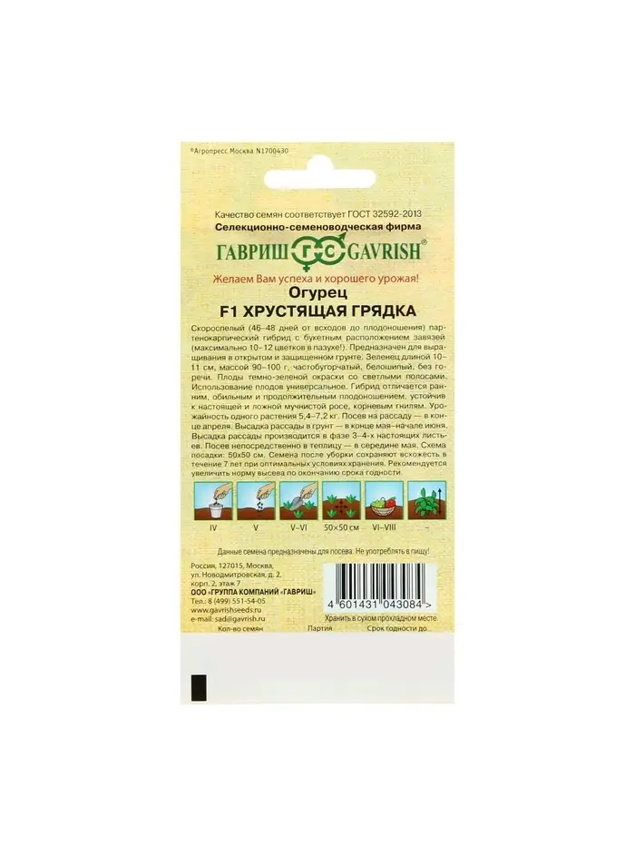 «F1 Хрустящая грядка» — это скороспелый партенокарпический гибрид с букетным заложением завязей, у которого период от всходов до плодоношения составляет 46–48 дней. Отличается ранним обильным и продолжительным урожаем. Устойчив к настоящей и ложной мучнистой росе, корневой гнили. Предназначен для открытого и защищённого грунта.