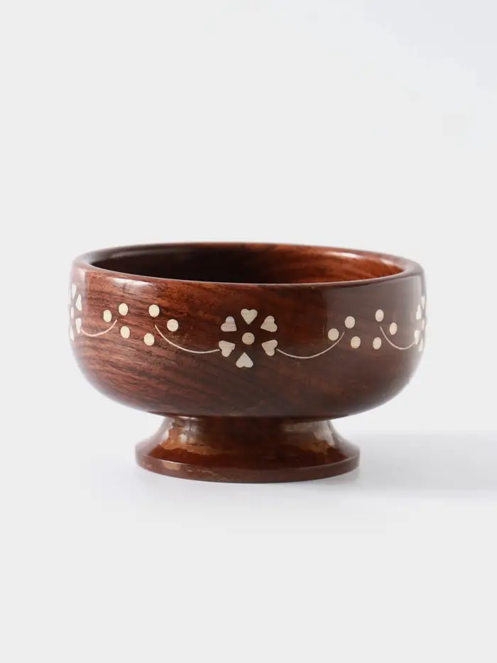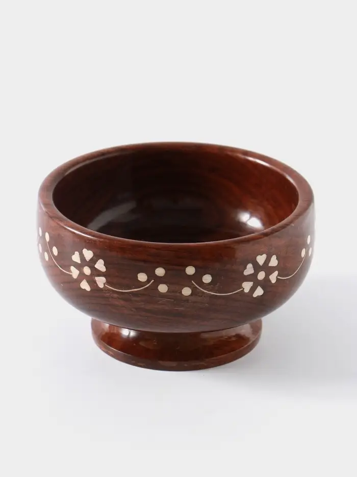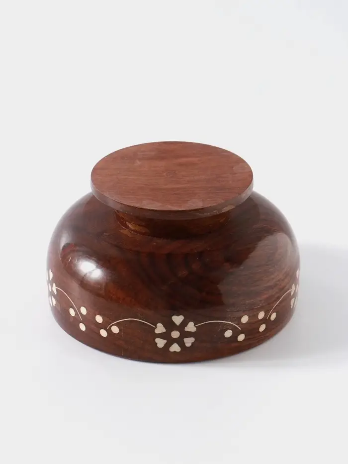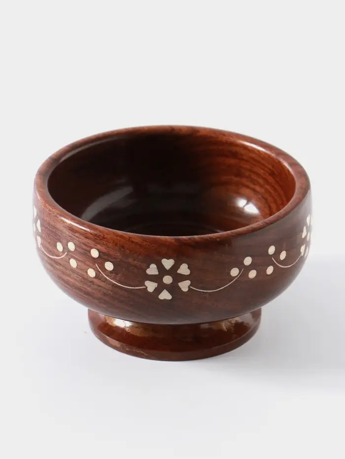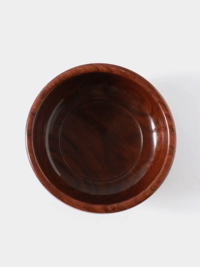 - Дерево шишам — прочность и благородство текстуры: Чаша выполнена из плотной и долговечной древесины шишам (индийского палисандра). Материал ценится за устойчивость к влаге и уникальный рисунок волокон. Со временем такая посуда не теряет вид, а приобретает глубину оттенка.