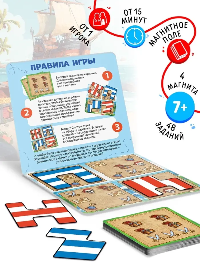 Магнитная игра-головоломка «Пиратский остров», 48 карт, 4 детали, 7+
