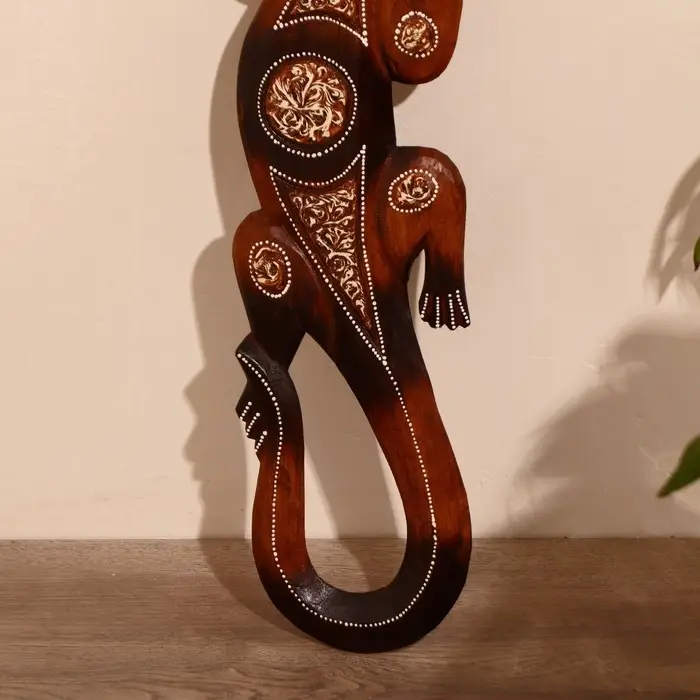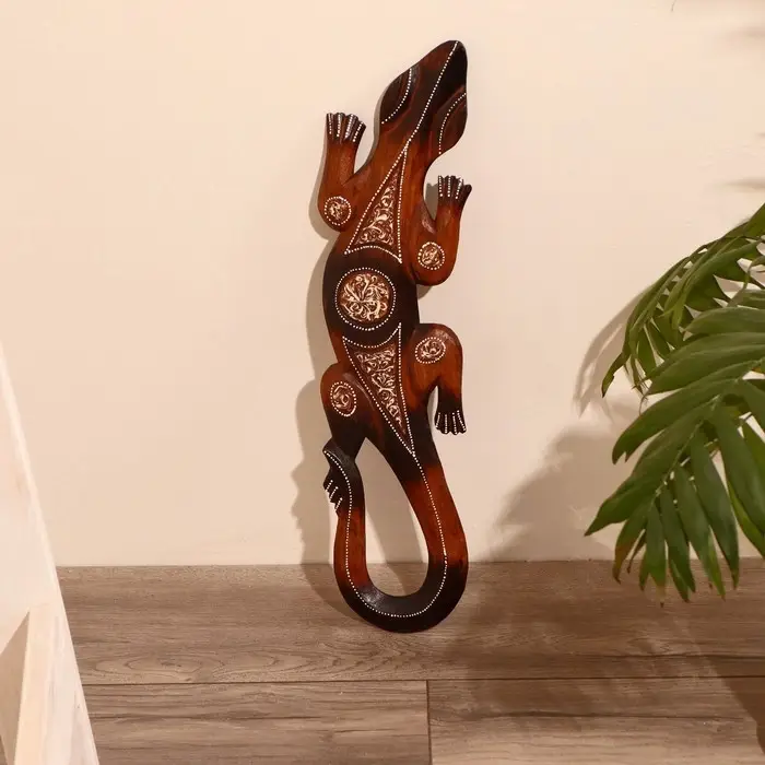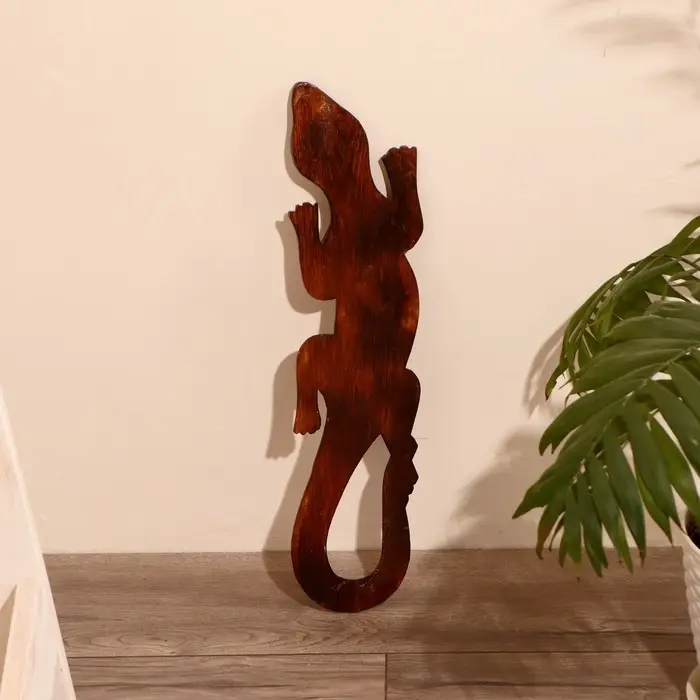 Не каждый осмелится разместить такое панно ручной работы в своем интерьере. Ведь порой кажется, что это настоящая живая рептилия. Искусные индонезийские мастера изобразили всё настолько детализировано четко, что хочется прикоснуться к панно дерево "Геккон" 50х12х1 см и ощутить тонкие линии изгибов этой «ящерицы счастья».