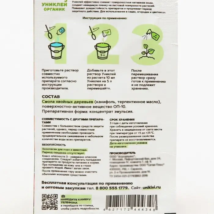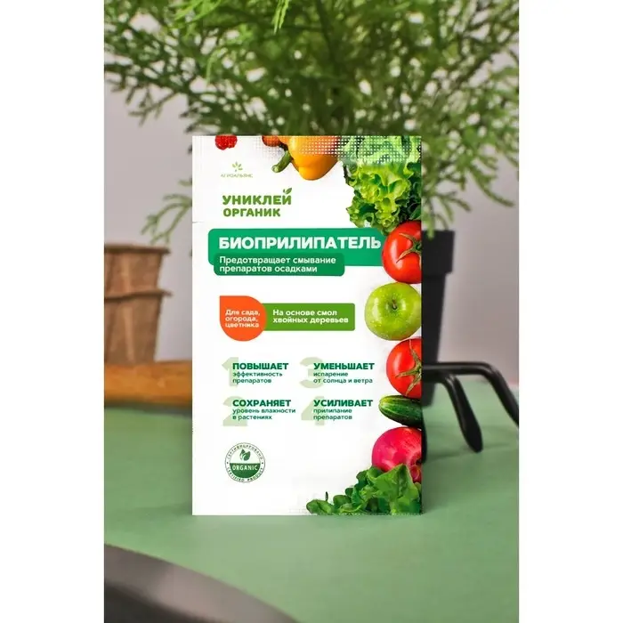 Биоприлипатель «Униклей Органик» (биоклей) - используется для повышения эффективности обработок защитными и питательными препаратами на овощных и плодово-ягодных культурах, декоративных растениях, для лучшего прилипания средств защиты растений, сохранения влаги, уменьшения испарения, способствует сохранению урожая.