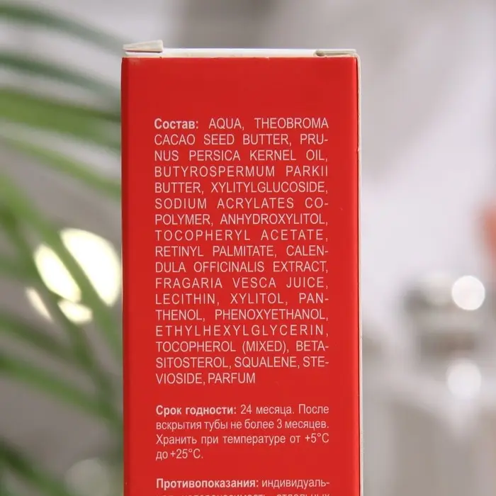 Состав: aqua, theobroma cacao seed butter, peach kernel oil, butyrospermum parkii butter, sodium acrylates copolymer, xylitylglucoside, anhydroxylitol, xylitol, lecithin, panthenol, tocopheryl acetate, retinyl palmitate, calendula officinalis flower extract, phenoxyethanol, ethylhexylglycerin, fragaria vesca juice, stevioside, parfum, tocopherol (mixed), betasitosterol, squalene, glyceryl linolenate.