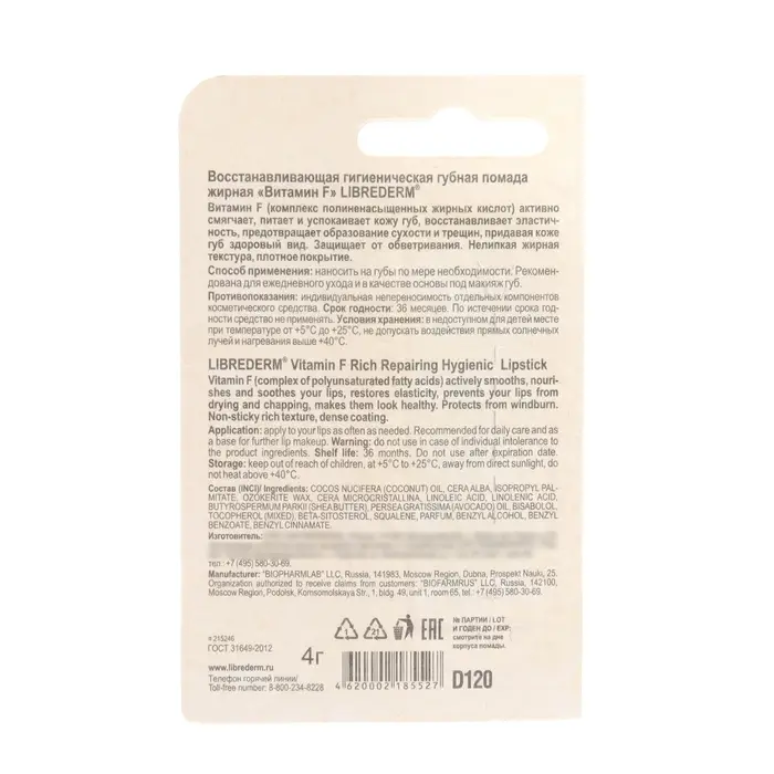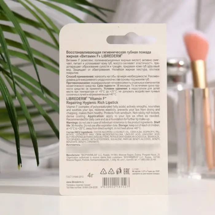 Помада гигиеническая Librederm Витамин F, восстанавливающая, жирная, 4 г