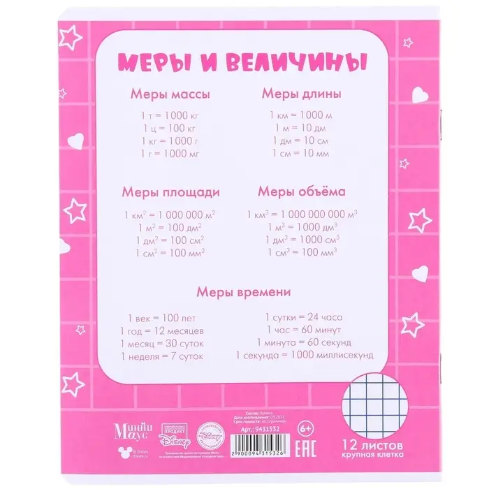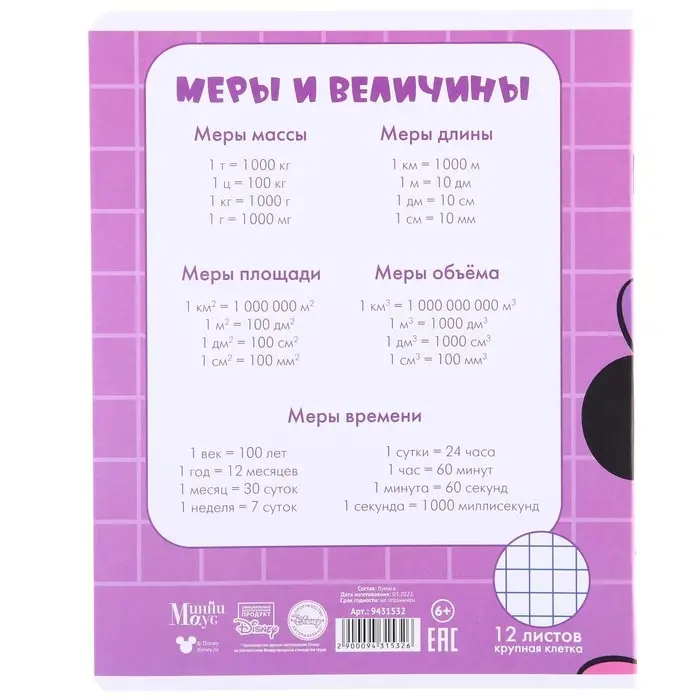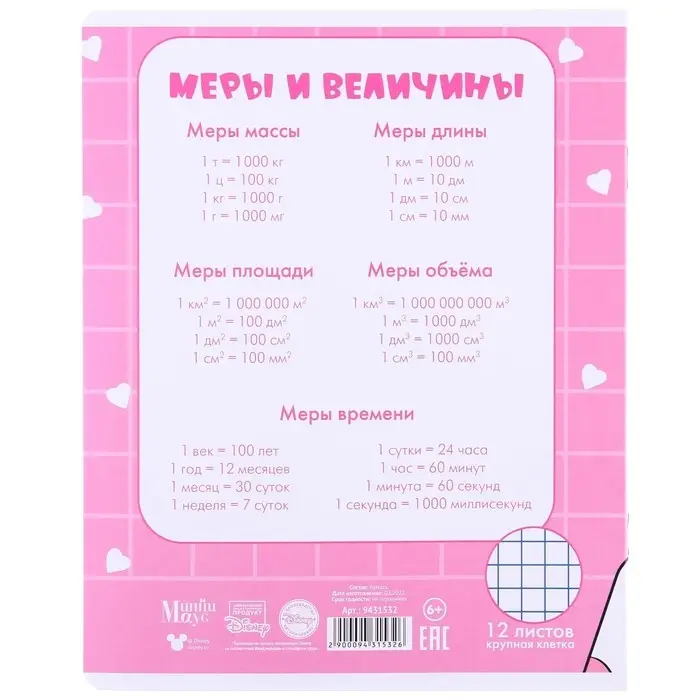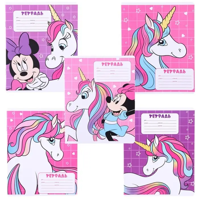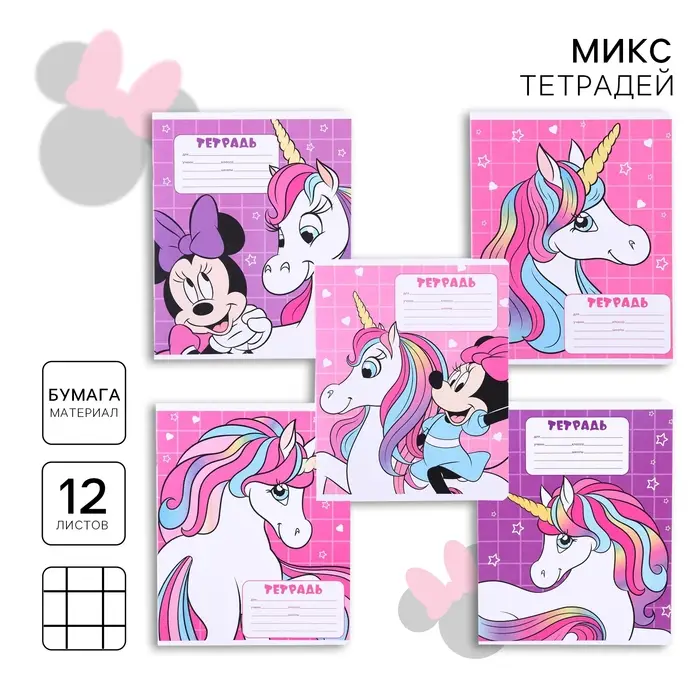 Тетрадь в крупную клетку 12 листов, 5 видов МИКС, обложка мелованная бумага, Минни Маус и Единорог