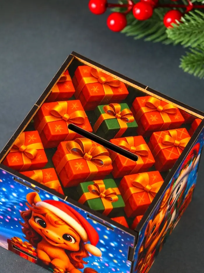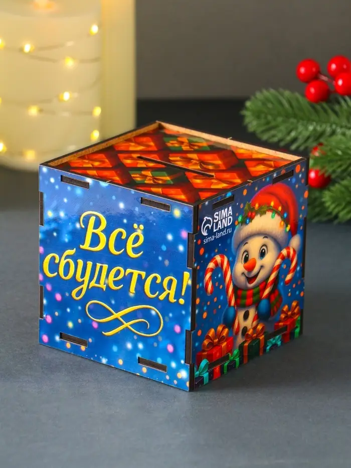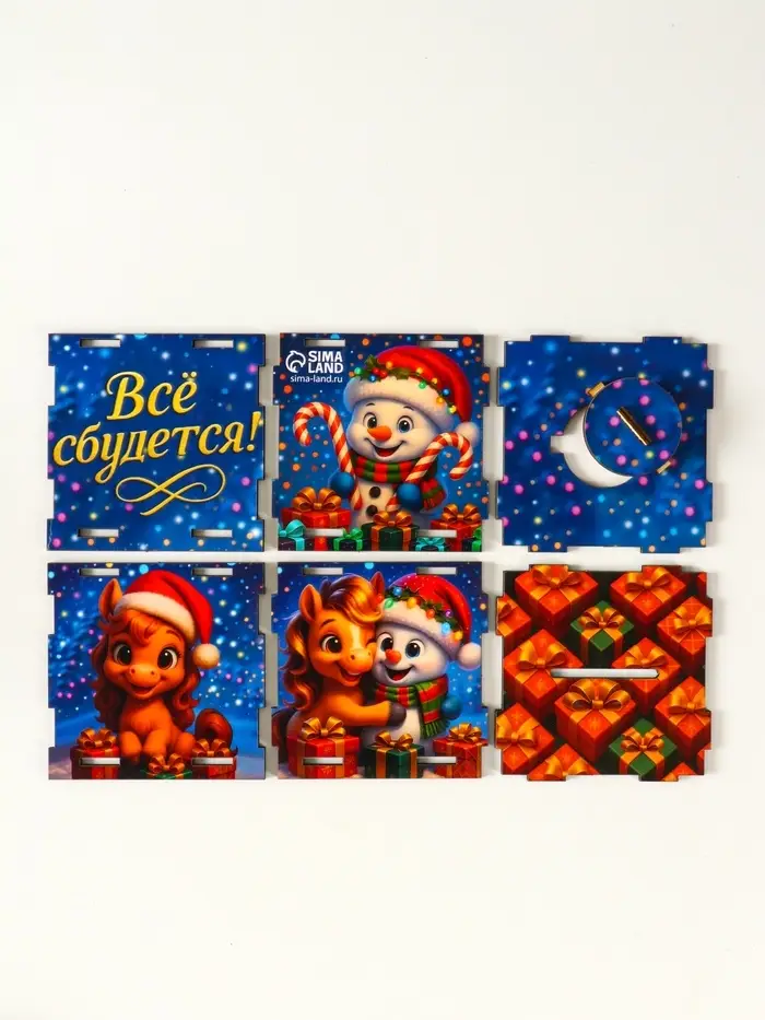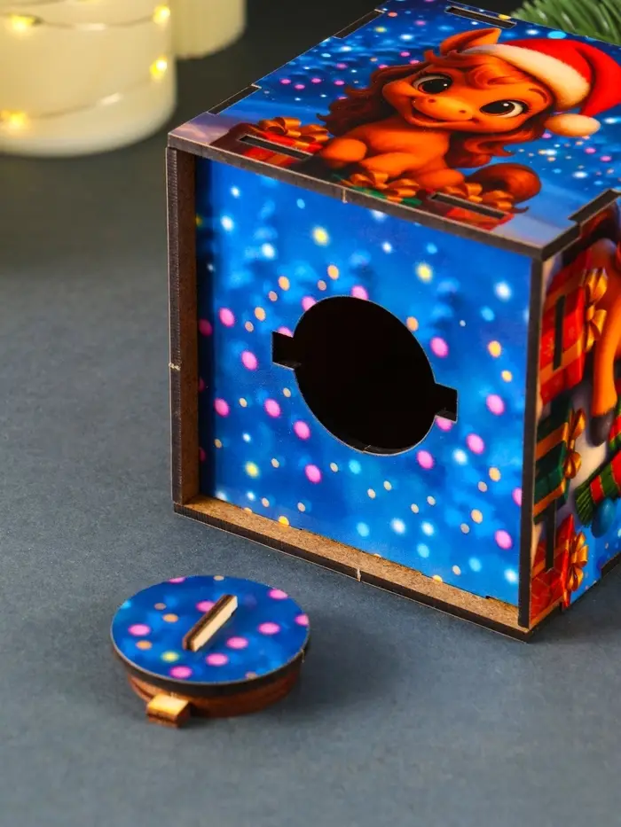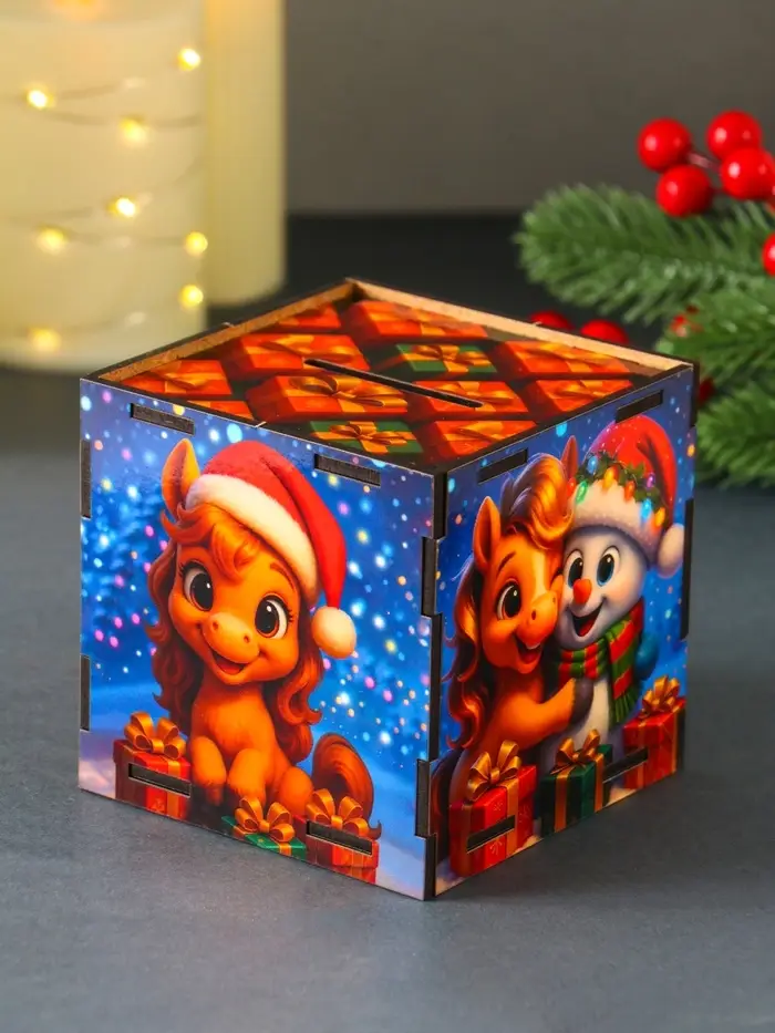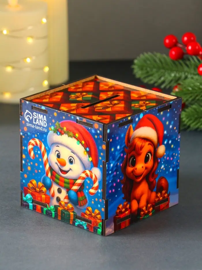 Новогодняя копилка куб "Снеговик с коняшкой" 10х10х10 см (набор 7 деталей)