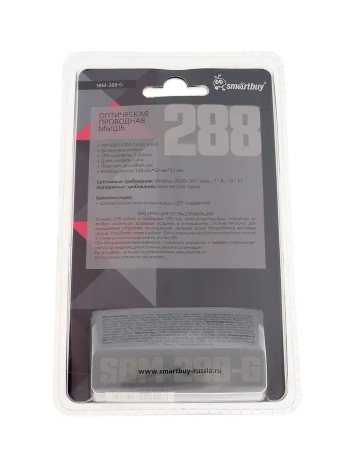 Мышь Smartbuy 288, проводная, оптическая, 4 кнопки, 2400 dpi, USB, с подсветкой, серая