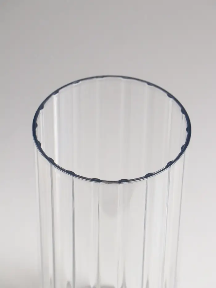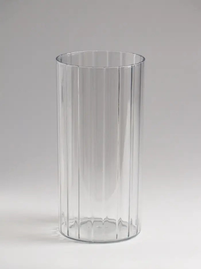 Прозрачная ваза с рифлёными линиями создаёт элегантный акцент для любого интерьера. Её строгий силуэт и игра света на гранях придают композициям из цветов особый объём и динамику.