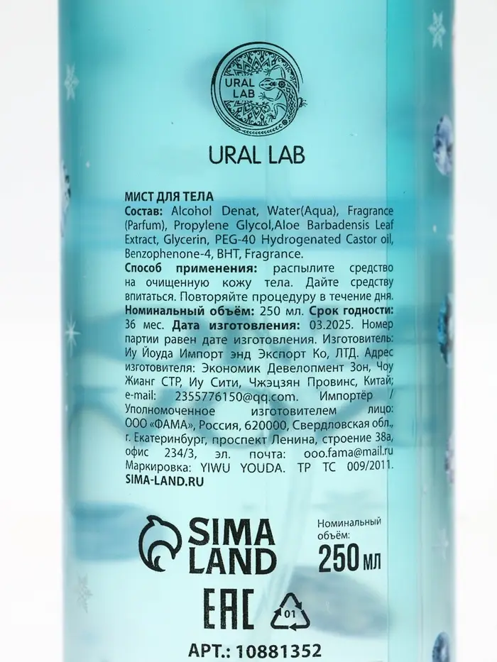 Парфюмированный мист для тела Diamond Snow, 250 мл, URAL LAB