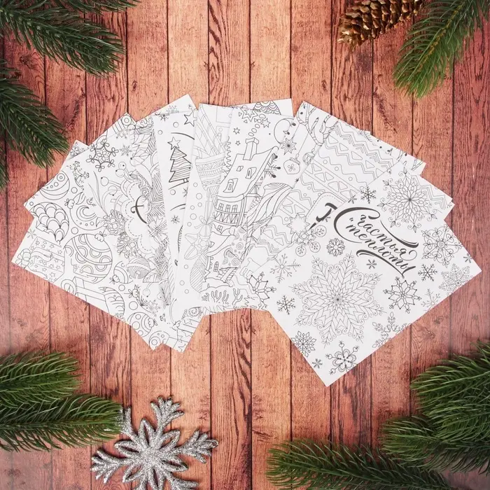 В набор входят 12 восхитительных новогодних открыток для раскрашивания с оборотной стороной почтовой открытки.