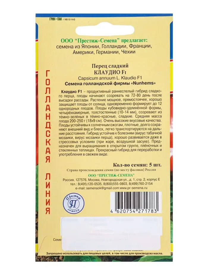 Семена Перец сладкий "Клаудио" F1, 5 шт