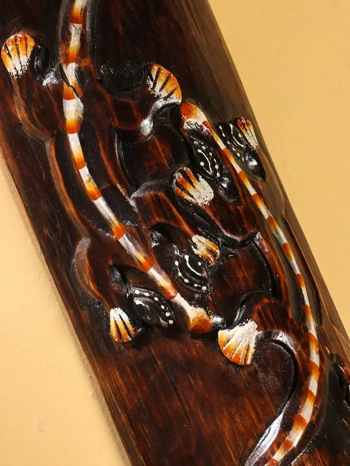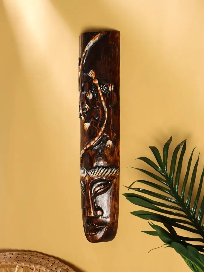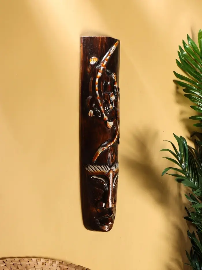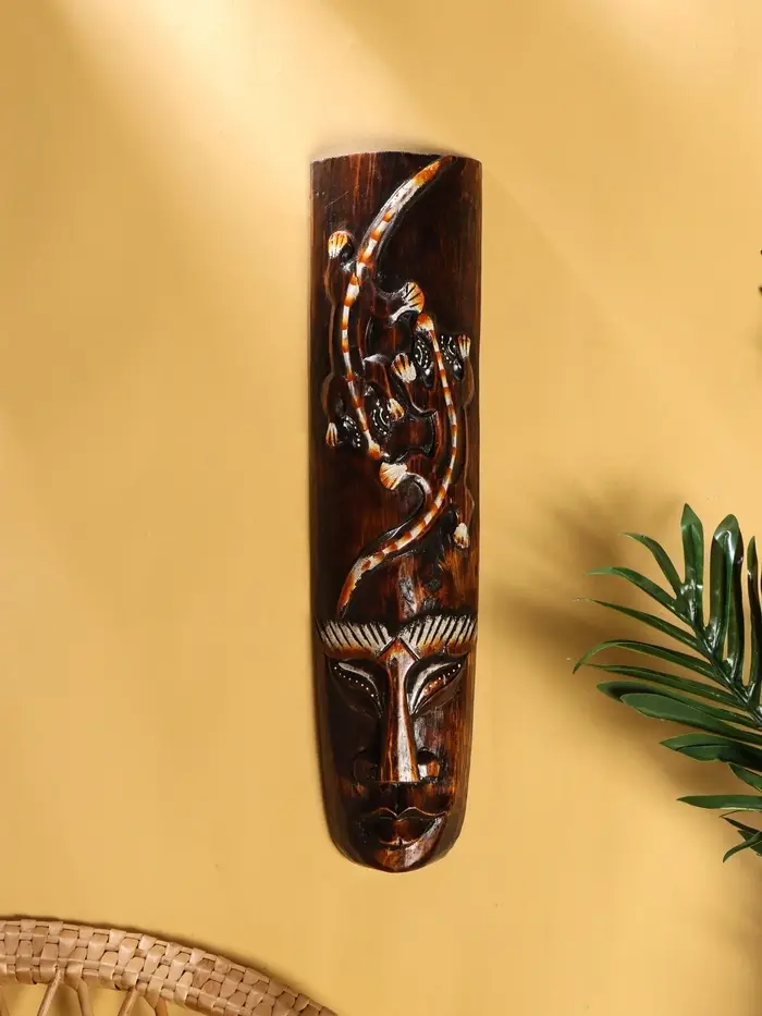 - Выразительный размер и форма: Маска высотой 50 см становится ярким акцентом на стене. Ее вытянутая, динамичная форма и тщательная резьба создают эффект движения, будто ящерица замерла на миг, прежде чем скрыться в тени.