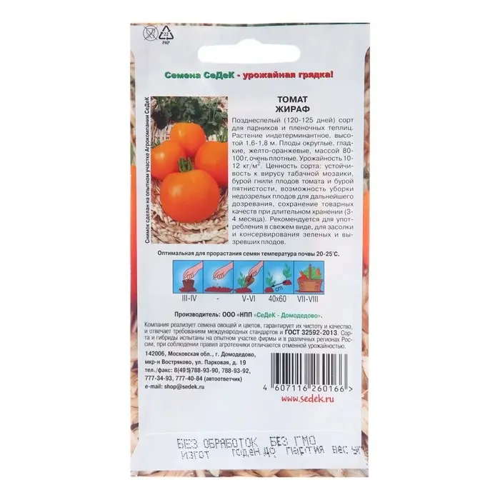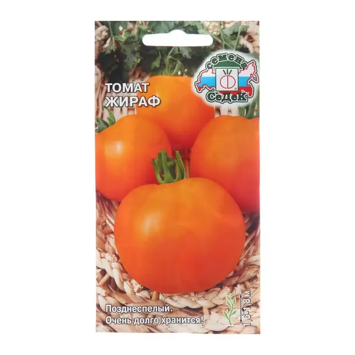 Позднеспелый (120-125 дней) сорт для парников и пленочных теплиц. Растение индетерминантное, высотой 1,6-1,8 м. Плоды округлые, гладкие, желто-оранжевые, массой 80-100 г, очень плотные. Урожайность 10-12 кг/м2. Ценность сорта: устойчивость к вирусу табачной мозаики, бурой гнили плодов томата и бурой пятнистости, возможность уборки недозрелых плодов для дальнейшего дозаривания, сохранение товарных качеств при длительном хранении (3-4 месяца). Рекомендуется для употребления в свежем виде, для засолки и консервирования зеленых и вызревших плодов.