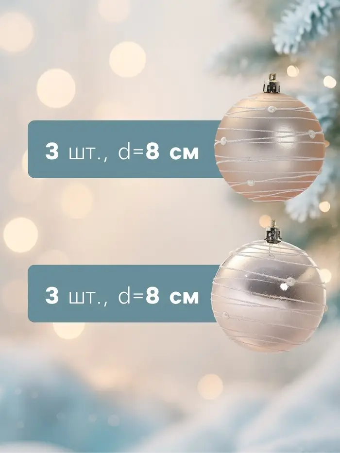 Эти шары создают образ праздника, где каждый элемент работает на общий стиль. Розовые и золотистые тона, крупные формы и точность деталей делают их центральным акцентом декора. Используйте игрушки как основу или как часть уже существующей композиции — они одинаково гармонично вписываются в разные интерьеры и подходы к оформлению Нового года.