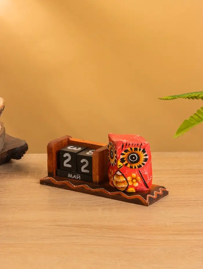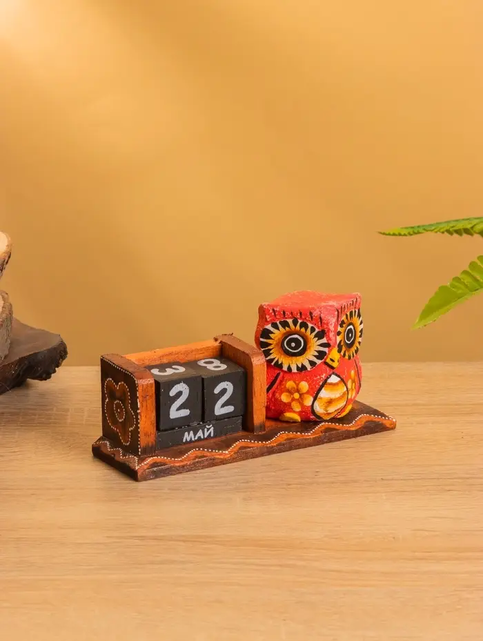 - Деревянный декор в виде совы: Календарь выполнен в форме мудрой птицы из натурального дерева. Теплая текстура и нежный розовый цвет делают его изящным украшением интерьера в стиле эко или кантри.